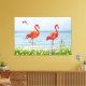 Vackra vibranta korallröda flamingor nära vita blommor och vegetabiliskt löv.