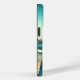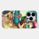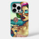 Retro stil kvinna i solglasögon med färgrikt hår och en lollipop med en strandbakgrund i psykedeliska färger.