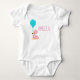 Denna barn baby body har en vacker rosa flamingo med en blå ballong. Barnets namn skrivs i vacker rosa stil. Gör din personlig idag!