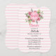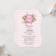 Vacker rosa randig bröllopsfestinbjudan med en rosa peonblomsterarrangemang högst upp, med en rosa skiva i mitten med text. Anpassa alla textfält för din bröllopshändelse.