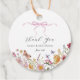 Bröllopsfest förmånsetikett med vildblommor, fjärilar och en rosa rosett. Anpassa med namn, evenemangsdatum eller anpassad text.