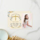 Tacka din familj och vänner för att de närvarade vid din dotters första kommunion genom att skicka dem ett tackkort med foto från första kommunionen. Detta vackra kommuniontackkort i smörkräm för flickor. Detta tackkort för första kommunion har ett vackert förgyllt kors med en förgylld ram mot en mjuk smörkrämgul bakgrund. En bukett vackra persika- och blåa akvarellblommor är placerade i varje hörn. Lägg ditt barns foto på framsidan och skriv ett förtryckt personligt meddelande med en signatur på baksidan för din bekvämlighet.
