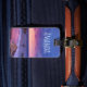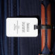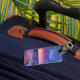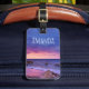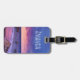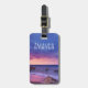 Ett bagagemärke med ett vackert foto som visar färg om lila, blått och rosa vid solnedgången. En söt kusten var utspridd med sten.
