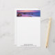 Stationär papper med ett vackert foto med en slående färg av lila, blått och rosa vid solnedgången. En söt kusten var utspridd med sten.