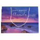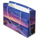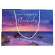 Giftväska med ett vackert foto med en slående färg av lila, blått och rosa vid solnedgången. En söt kusten var utspridd med sten.