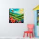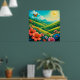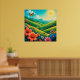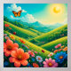 Livlig landskapsporträtt med livfulla vilda blommor under en solbelyst himmel, omgiven av frodiga böljande kullar och naturlig skönhet, som skapar en visuellt lugnande och glad atmosfär.