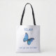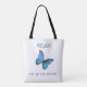 Vacker stor blå Morpho fjäril på vit Totebag. Punkttext kan anpassas. En blå fjäril är en önskegivare enligt många kulturer.