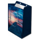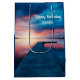 Gåsväska med ett strålande foto. En scenisk plats. En trevlig lugn sjö med trädocka utåt. Genom att ställa in sol får du ett vackert färg i himlar, ett levande rött och blått.