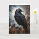 Storslagen svart korp som sitter på en trädgren i skogen med fullmåne i bakgrunden. Tom välkomstkort för födelsedag, årsdag, ny bebis, tack, sympati, etc.