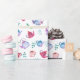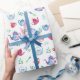 Sött tekalasett-mönster utfört i akvarell i blåa, lila och röda nyanser med gröna skedar och teblad på vit bakgrund.