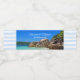 Bröllop vattenflaska-etiketter med ett foto av en turkosblå havsstrand med stort sten utspridt längs kusten. Ljus och soligt tropiskt språk.