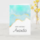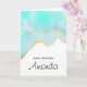Grattis på födelsedagen kort med en livfull sommar design. Turkos / akvagrön akvarellbild med en vågig falsk guldbord. Elegant och vacker.