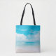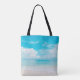 Vacker tropisk strand med blå himmel och vit c tygkasse