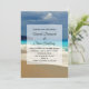 En bröllopsinbjudan med ett vackert fotografi som visar ett turkosblått hav och en sandstrand med berg i bakgrunden.