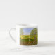 En mugg med en vacker bild av ett naturscen: En fågel som sitter på ett väderbitet staket, vilda blommor som växer runt staketet, en bonde på en traktor, som arbetar på sin mark, träd med blad och jordbruksmark med olika färger. Bakgrunden och bilden kan anpassas. Text kan läggas till. Originalkonst av W.B.