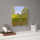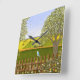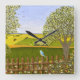 En klocka med en vacker bild av ett naturscen: En fågel som sitter på ett väderbitet staket, vilda blommor som växer runt staketet, en bonde på en traktor, som arbetar på sin mark, träd med blad och jordbruksmark med olika färger. Bakgrunden, bilden och texten kan anpassas. Originalkonst av W.B.