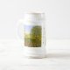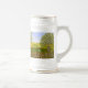 En ölmugg med en vacker bild av ett naturscen: En fågel som sitter på ett väderbitet staket, vilda blommor som växer runt staketet, en bonde på en traktor, som arbetar på sin mark, träd med löv, och åkermark med olika färger. Bakgrunden, bilden och texten kan anpassas. Originalkonst av W.B.