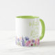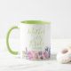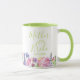 En speciell gåva till brudens mor, denna vackra färgglada mugg har en akvarell vildblomsterträdgård med "mor till bruden" i en elegant handskriven typografi i en mjuk grön färg som matchar insidan och handtaget. Personliggör med ert bröllopsdatum.