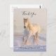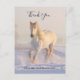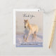 Tack-kort med ett fotografi av en magnifik vit häst. Springande genom ett snötäckt fält. Majestätisk och vacker.