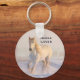 En nyckelkedja med ett foto av en underbar vit häst. Körs genom ett snö täckt fält. Majestisk och vacker.