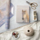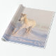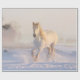 Papper med ett foto av en underbar vit häst. Körs genom ett snö täckt fält. Majestisk och vacker.