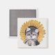 Unik målning av en vacker Yorkshire Terrier Hund som sitter framför en solros på en ljus silverbakgrund.