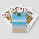 Spelkort med ett landskapsfoto av en tropisk strand. Varmsand, azure vatten och blå himmel med tropiska löv längs toppen.