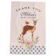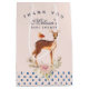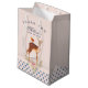 En babyduschpåse med en vacker brun doe med vita fläckar på hennes päls. En söt fågel sitta på hjorten. En elegant blomma arrangemang som består av ro och ljust grönt löv med vattenfärg. En blå polarpunkt gräns med persikobakgrunden längs grund. Älskling och förtjusande design.
