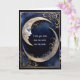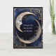 Ett vackert och serene ansikte i ett kuster måne, innanför guld ram på en mörk blått gradientbakgrund, gör ett utmärkt födelsedagskort för kärlek.