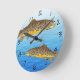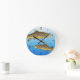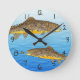 Två bruna öring simmar längs blå vatten, medan en öring är efter en torr flygfiske. Hand plockade efter konstnär ©Tina Hesskew of Fishing Hunting Life. Svarta siffror för att berätta tiden.