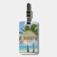 En bagagetapp med ett vackert och stillastående foto på 2 handflatan träd under ett ljust blå himmel. Stå på en utspridd tropisk strand med lugn turkos vatten.