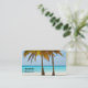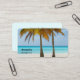 Affärskort med ett vackert och stillastående foto på 2 handflatan träd under ett starkt blå himmel. Stå på en utspridd tropisk strand med lugn turkos vatten.