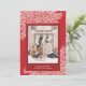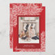 Snygg Helgdag-fotokort i hand plockade med röd bild på baksidan med en snöflinga mönster i rött och vitt. Glästa Helgdagar, vit och röd illustration.