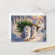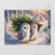 En förtjusande illustration av snö uggla som transporterar Julgran genom en serentäckt vinterskog täckt av snö. Uggla, med sina vackra vita och grått-fjädrar, omges av en magisk dimma som betonar tidigt morgonens soluppgång. Den lilla, pikturesska täckningen med rökaffisch från skorsten kan ses i avstånd. Hela scenen är målad med en fängslande blandning av mjukt och varmt färg som framkallar en känsla av fred och .