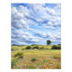 Ett bildlandskap som visar färglösa vilda blommor under ett himmel fyllt med dramatiska vita moln. Den sceniska synen förmedlar en känsla av lugn och naturskönhet, perfekt för naturentusiaster.