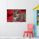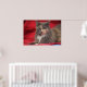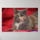 En vacker katthattavslappning på ett rött matta mot röd bakgrund.