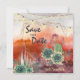 Detta vackra bröllop spara datum har en varm bakgrund av jordtoner i vatten färg och har ett vackert geometriskt hjärta som omges av sukulenter och blommar cacti. Likaså finns det ett glansigt ljus som med stor noggrannhet dränktes över scenen. Anpassa enkelt det här datumet med din information.