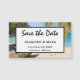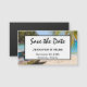 Ett bröllop spara datum-magnetiskt affärskort. Personlig med bridens namn, bröllop datum och plats. En idyllisk tropisk strandscen. Turkos blå kristallklar vatten och en mjuk brun sandstrand. Vissa handflatan lämnar att hänga uppifrån. En gammal trärowboat sitter på stranden. Ett gott och fredligt landskap.