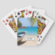 Personlig spelar kort med en idyllisk tropisk strandscen. Turkos blå kristallklar vatten och en mjuk brun sandstrand. Vissa handflatan lämnar att hänga uppifrån. En gammal trärowboat sitter på stranden. Ett gott och fredligt landskap.