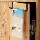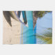 Kökshandduk med en idyllisk tropisk strandscen. Turkos blå kristallklar vatten och en mjuk brun sandstrand. Vissa handflatan lämnar att hänga uppifrån. En gammal trärowboat sitter på stranden. Ett gott och fredligt landskap.