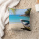 En kudde med en idyllisk tropisk strandscen. Turkos blå kristallklar vatten och en mjuk brun sandstrand. Vissa handflatan lämnar att hänga uppifrån. En gammal trärowboat sitter på stranden. Ett gott och fredligt landskap.