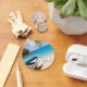 En nyckelkedja för personlig med en idyllisk tropisk strandscen. Turkos blå kristallklar vatten och en mjuk brun sandstrand. Vissa handflatan lämnar att hänga uppifrån. En gammal trärowboat sitter på stranden. Ett gott och fredligt landskap.