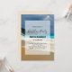 Födelsedagsfest inbjudan med ett vackert foto med ett turkosblått hav och en sandstrand med berg i ryggen.