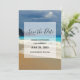 Spara datumkortet med ett vackert foto med ett turkosblått hav och en sandstrand med berg i ryggen.