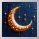 Bilden visar en vackert upplyst halvmåne prydd med gnistrande ljus. Månen är placerad mot en djupblå texturerad bakgrund som skapar en nattlig himmelstämning. Hängande från månen finns flera små, lysande stjärnor som alla reflekterar samma gyllene nyans. Den övergripande effekten är magisk och fantasifull och frammanar en lugn nattlig scen fylld med tindrande himlakroppar.