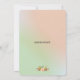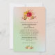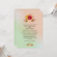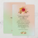 En bröllopsinbjudan med ett utrymme på baksidan för din bröllopswebbplats. Med en vacker åkerväxtdesign med blommor i rött och gult, kontrasterad med rosa och bruna blad och kvistar. Satt på en mintgrön och ljus korallrosa gradientbakgrund.