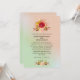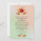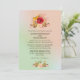 En bröllopsinbjudan med en vacker vildblomsdesign med röda och gula blommor, kontrasterande med rosa och bruna blad och kvistar. Satt på en mintgrön och ljus korallrosa gradientbakgrund.