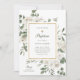 Dessa vackra Baptism- eller julklappningsinbjudningar har ett faux guld ram omgivet av söt kräm och vita blommor samt eukalyptus grey och löv. Det finns också en matchande faux guld kor och klassisk grönt på vit bakgrund.