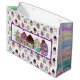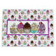 Vackra rosa och lila handritade fantastiska choklad-, jordgubb-, vanilj- och körsbärskakor och prickiga födelsedags-, baby shower- eller bröllopsgåvpåse.