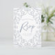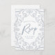Para ihop dina bröllopskort med dessa vackra RSVP-kort med en touch av mjuk silverglitter, blomsterliknande spetsramdesign med blad och dammig blå typografi. Perfekt för vintersäsongen, såväl som året runt.